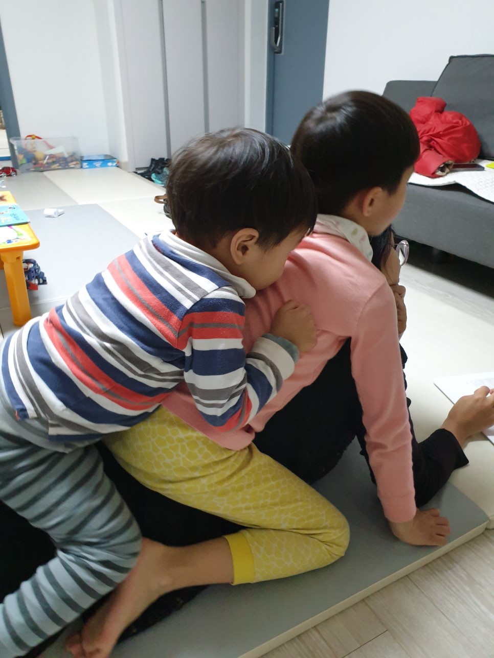 퇴근한 엄마 등 위에 올라탄 아이들
